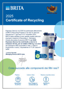 Anche per il 2025, Espresso Service è orgogliosa di annunciare il rinnovo della propria partecipazione al BRITA Recycling Program. Questo importante riconoscimento, sancito dal “Certificate of Recycling", testimonia l’impegno attivo dell’azienda nel recupero e nel riciclo delle cartucce esauste utilizzate durante l'anno.